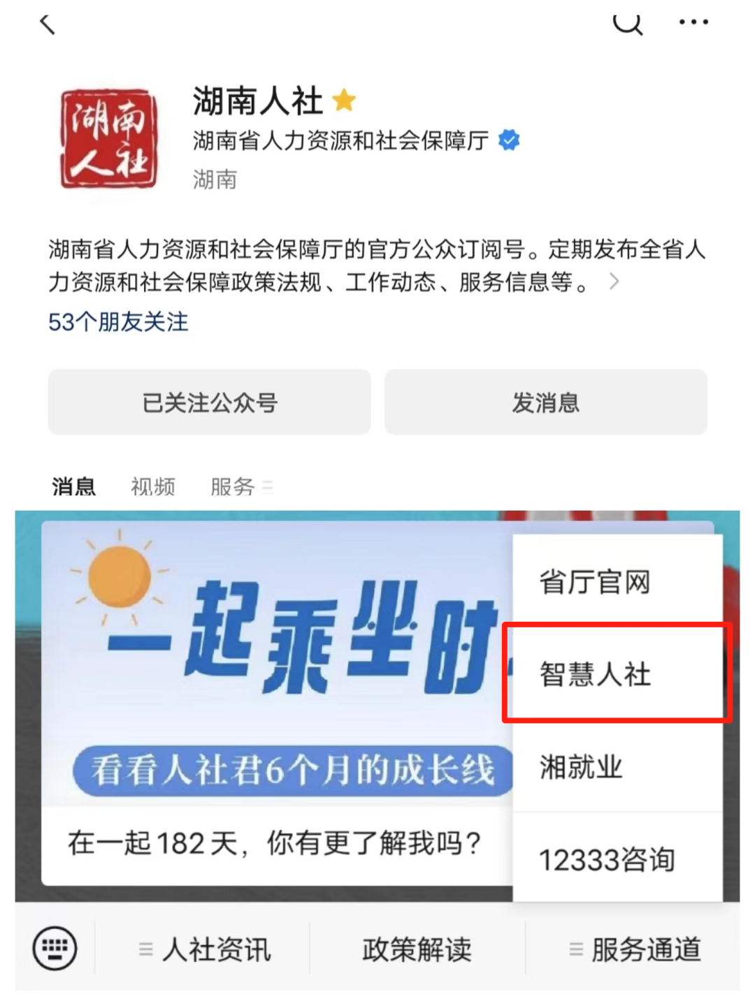 2、關(guān)注“湖南人社”“智慧人社”微信公眾號,點(diǎn)擊【服務(wù)通道】→【智慧人社】→【更多】→【社會(huì)保險(xiǎn)-失業(yè)保險(xiǎn)金申領(lǐng)】→【失業(yè)保險(xiǎn)金申領(lǐng)】辦理;